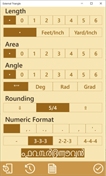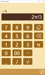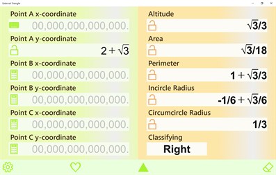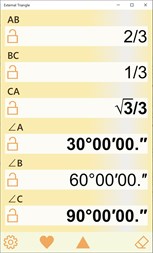 This application is a Triangle calculator. (From some known value input, it calculates other value.) For both educational purpose and practical purpose like design, it equips the below functions that were not available in existing similar software. * Calculation parameter expansion like area,coordinates, etc., and calculation combinations expansion. * Length and area fields equip input and calculation result with fraction, square root, number with π, or yard/feet/inch. * Angle field equips input and calculation result with Deg/Min/Sec or radian(number with π).