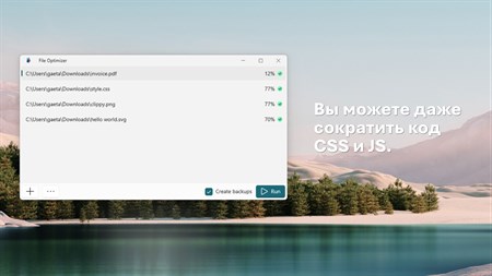 Представляем вам приложение для оптимизации файлов, призванное помочь вам сэкономить место и уменьшить беспорядок на ваших устройствах, уменьшить размер изображений для сайта или минифицировать CSS-код. Наше приложение использует передовые алгоритмы сжатия для уменьшения размера файлов без ущерба для их качества и удаления метаданных. Всего несколько щелчков мышью позволят вам уменьшить размер больших документов, изображений, видео и других файлов, освободив ценное пространство для хранения данных. Попробуйте наше приложение для оптимизации файлов уже сегодня и убедитесь в разнице!
