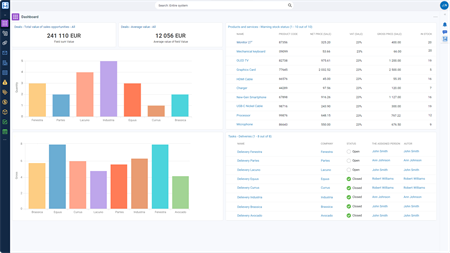 Firmao.net также позволяет вам подготавливать и отправлять заявки и предложения, складские документы, счета-фактуры и другую соответствующую документацию одним щелчком мыши. Эти шаблоны документов также могут быть установлены и свободно изменены. Создание определенных документов (например, запасов на складе) также может обновлять связанную информацию (например, уровни запасов) в режиме реального времени. Проекты можно планировать вместе со связанными задачами для обеспечения точного контроля сроков и бюджетов. Модуль «Активы/Оборудование» обеспечивает быструю и гибкую инвентаризацию, а с помощью распечаток шаблонов можно создавать любые отчеты/списки задач, а также наклейки со штрих-кодом.