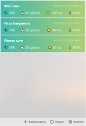 С помощью этой программы можно снимать показания с датчиков Xiaomi Mi Flora Plant Monitor. Спаривать устройства нет необходимости, программа просто работает, даже с устройствами предназначенными только для Китая. Можно запомнить все свои датчики и обновлять только их.