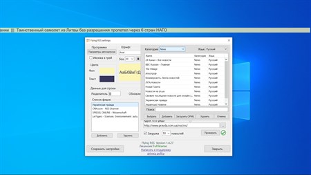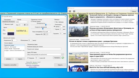 Достоинства FlyingRSS: - Поддержка RSS, Atom, RDF форматов - Вы можете подключать неограниченное количество RSS каналов и тем самым получать только интересные для Вас новости разной тематики - открыть интересующую новость проще простого – дважды кликните на бегущей строке и в открывшемся окне кликните на интересной новости - выбор цвета для текста и фона - выбор шрифта, его размера и стиля - регулировка прозрачности фона, хоть полностью прозрачный - регулировка скорости движения текста - расположение сверху всех окон или как обычное окно - настраивайте таймеры для отображения строки на экране и ее скрытия - выбор языка интерфейса. Доступны английский, немецкий, французский, русский - легкое подключение RSS канала. Просто введите его URL - возможность указать время обновления установленного RSS канала и сколько последних новостей отображать в бегущей строке - более 300 уже предустановленных RSS каналов разной тематики на четырех языках (английский, немецкий, французский, русский) - список RSS каналов разделен на категории и языки для легкого поиска и выбора - возможность добавить в список свой любимый канал в любую категорию. Или даже загрузить список RSS каналов из OPML файла - символическая цена приложения по сравнению с другими RSS читалками, а главное - удобство использования и навсегда