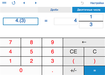 • ПЕРЕВОД ОБЫКНОВЕННЫХ ДРОБЕЙ В ДЕСЯТИЧНЫЕ И НАОБОРОТ - Калькулятор для перевода обыкновенных дробей в десятичные и десятичных дробей в обыкновенные. - Округление дробей до ближайшей 1/2, 1/4, 1/8, 1/16, 1/32, 1/64, 1/128, 1/256. - Для перевода обыкновенной дроби в десятичную: выберите опцию "Дроби", введите дробь и нажмите знак "=". - Чтобы перевести десятичную дробь в обыкновенную, выберите опцию "Десятичные числа", введите десятичное число и нажмите знак "=". При вводе периодических дробей, период надо заключить в скобки. Например, число 0.24333... должно быть записано 0.24(3), число 5.123123... как 5.(123).