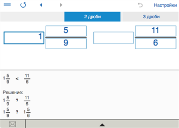 • СРАВНЕНИЕ ДРОБЕЙ - Калькулятор для сравнения 2 и 3 дробей. Чтобы сравнить три дроби, Вы должны выбрать альбомную ориентации. - Показывает пошаговое решение. - С помощью этого калькулятора можно сравнивать дроби и смешанные числа.