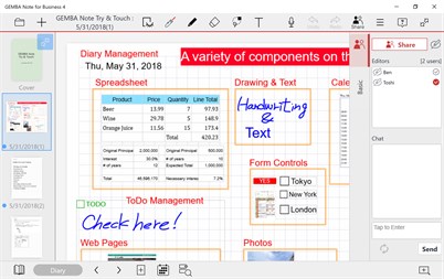 GEMBA Note utilizes award-winning technology from our Note and Share apps. For personal note-taking, it provides users with the capabilities to annotate PDF documents, hand write or type notes, draw diagrams using a wide selection of pen styles and colors, sketch designs, take photographs, capture web pages, and audio. Mash up all of these information capture approaches in a fully scalable and editable workbook.