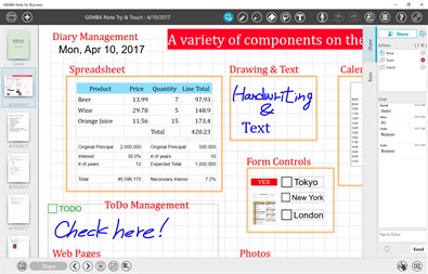 GEMBA Note utilizes award-winning technology from our Note and Share apps. For personal note-taking, it provides users with the capabilities to annotate PDF documents, hand write or type notes, draw diagrams using a wide selection of pen styles and colors, sketch designs, take photographs, capture web pages, and audio. Mash up all of these information capture approaches in a fully scalable and editable workbook.