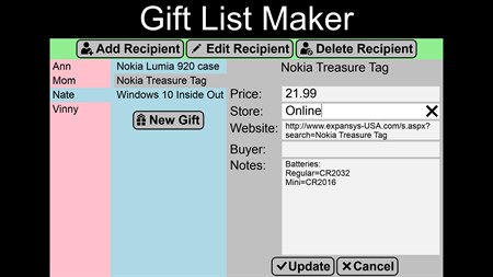 Gift List Maker is a utility for keeping track of what your friends and family (and even yourself!) want for Christmas, your birthday, or just when you have a little extra money to spend! Along with the name of the items, you can keep track of the price, where it is available, a website with more info or where it can be purchased, who is buying the gift (so you don't buy someone a gift that someone else already got them), and just random notes. Very useful for when somebody says they like something and then you forget about it when Christmas comes around! You can also synchronize your list(s) with the Windows Phone version of this app using your OneDrive account or have one or everyone's lists sent as an email.