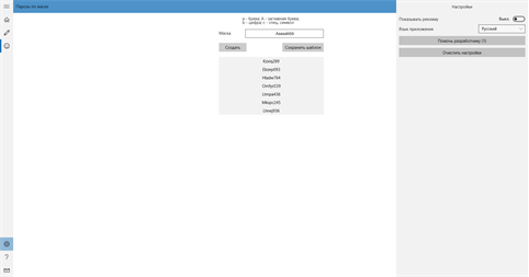 Данное приложение – инструмент для генерации паролей с широкими возможностями настройки. Подойдёт как для тех, кому надо сгенерировать пароль в один клик, так и для тех, кому требуется точная настройка под свои задачи. Возможности приложения: - Создание паролей и пин-кодов по системным и пользовательским шаблонам; - Создание пароля по параметрам (длина, наличие и количество букв разного регистра, цифр, специальных символов); - Создание пароля по маске (указывается на каком месте должен быть тот или иной тип символов); - Сохранение своих шаблонов пароля по параметрам и по маске для быстрого доступа к их созданию с главной страницы; - Синхронизация шаблонов и настроек на разных устройствах (если они привязаны к одной и той же учётной записи Microsoft). Данное приложение абсолютно бесплатно и по умолчанию не показывает рекламы, но если вы захотите поддержать разработчиков, то в настройках вы можете включить показ рекламы (прямоугольный баннер в нижней части приложения) или перевести нам небольшую сумму денег. О своих пожеланиях, предложениях и найденных ошибках сообщайте прямо из приложения с помощью кнопки «Обратная связь».