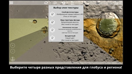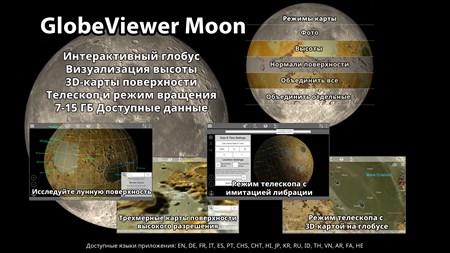 GlobeViewer Moon - это интерактивное трехмерное изображение всей поверхности Луны. Представление вращения земного шара обеспечивает обзор всех существующих обозначений для различных элементов поверхности. Если вас интересует конкретный регион, можно загрузить трехмерную карту с еще более высоким разрешением, чтобы внимательно рассмотреть кратеры, канавки и другие особенности.