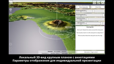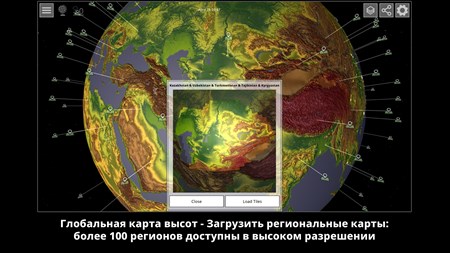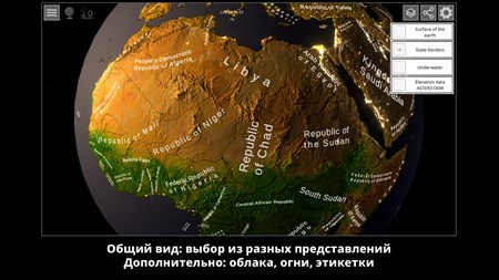 - Интерактивный 3D глобус с наземной, подводной и топографической картой - Набор трехмерных топографических карт высокого разрешения для всей земной поверхности, разделенный на 22 912 отдельных фрагментов.