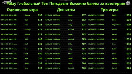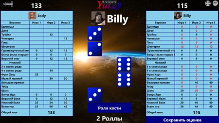 Yatzy пять в своем роде и дает вам пятьдесят очков за первый Yatzy и сто очков за каждый дополнительный Yatzy в той же колонке игры.