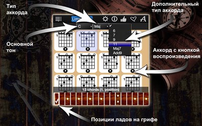Внимание! Lite версия предоставляет аккорды первых 4 нот. Для полного набора нот необходима полная версия программы.