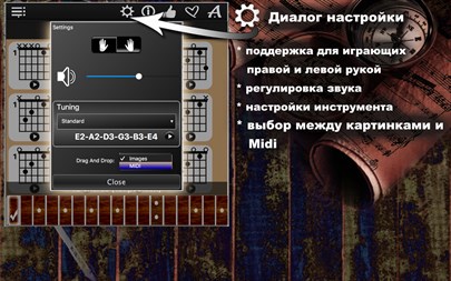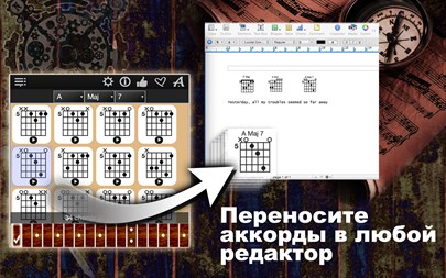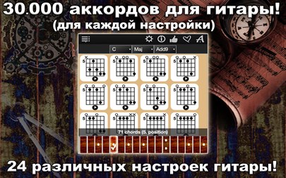 GuitarChordsCompass влючает в себя: - Число аккордов: 30000. - Изображение различных типов аккордов и наборов аккордов, которые полностью совместимы со Смарт- инструментами программы GarageBand. - Уникальная возможность прослушивать каждый аккорд на экране. - С помощью Drag&Drop Вы сможете перенести нужные Вам аккорды в GarageBand для создания своих собственных музыкальных композиций. - С помощью Drag&Drop Вы сможете перенести нужные Вам аккорды и сохранить их в своих музыкальных cборниках. - Поддержка 56 типов аккордов: Maj, Maj 6, Maj 7, Maj 9, Maj 11, Maj 13, Maj Maj7, Maj Add9, Min, Min 6, Min 7, Min 9, Min 11, Min 13, Min Maj7, Min Add9, Dim, Dim 6, Dim 7, Dim 9, Dim 11, Dim 13, Dim Maj7, Dim Add9, Aug, Aug 6, Aug 7, Aug 9, Aug 11, Aug 13, Aug Maj7, Aug Add9, Sus2, Sus2 6, Sus2 7, Sus2 9, Sus2 11, Sus2 13, Sus2 Maj7, Sus2 Add9, Sus4, Sus4 6, Sus4 7, Sus4 9, Sus4 11, Sus4 13, Sus4 Maj7, Sus4 Add9, 5, 5 6, 5 7, 5 9, 5 11, 5 13, 5 Maj7, 5 Add9, - Звук настоящей гитары. - Приложение поддерживает все распространённые виды настройки: 1. Standard, 2. New standard, 3. Lute, 4. Half tone flat, 5. Whole tone flat, 6. Half tone sharp, 7. Whole tone sharp, 8. Drop B, 9. Drop C, 10. Drop D, 11. Double dropped D, 12. Celtic, DADGAD 13. DADADD, 14. Open A, 15. Open C, 16. Open D, 17. Open E, 18. Open G, 19. Slide open A, 20. Standard C, 21. Esus, 22. Drop C#, 23. Low C, 24. All Fourth, - Поддержка для левшей. - Регулируемая громкость.
