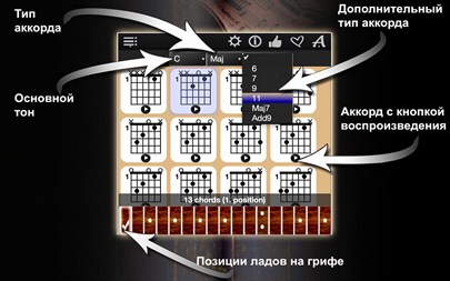 БЕСПЛАТНО пробуйте 1 день! Найдите идеальные аккорды для своих пьес на гитаре! Благодаря специально разработанному алгоритму, Gitar Chords Compass сможет Вам показать все возможные аккорды во всех 17 позициях. Для этого выберите основу аккорда слева, тип аккорда в центре и дополнительный тип справа. И начинайте играть!