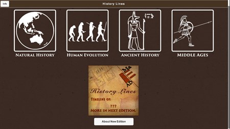 Another app about History. Useful for Historians and History enthusiasts. This app contains 4 sections: - Natural History: This timeline of Natural History summarizes significant cosmological, geological and biological events from the formation of the Universe to the rise of modern humans. (From 13,798 ± 0,037 Ma to 0.2 Ma) - Human Evolution: The timeline of Human Evolution outlines the major events in the development of the human species, and the evolution of humans' ancestors. It includes a brief explanation of some animals, species or genera, which are possible ancestors of Homo. (From 4000 Ma to 12 ka) - Ancient History: Timeline of Ancient History is the historical events in time of the documented ancient past from the beginning of recorded history until the Early Middle Ages. (From 3500 BC to 476 AD) - Middle Ages: Timeline of the major events during the Middle Ages, a time period in human history mostly centered on Europe, which lies between classical antiquity and the modern era. (From 410 AD to 1499 AD) Include more than 50 questions about the other simultaneous events. You may help us to improve this app by send free picture via Email (in app).