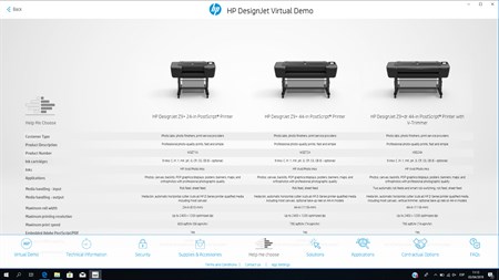 HP DesignJet Virtual Demo is an easy to use sales tool for HP Sales and HP Partners. It has all the information that the sales staff will need for their client visit, providing easy access and a 360º view of the printer which shows the main characteristics of the product, videos, technical data sheets and documentation which is continually updated with the most up-to-date version. With this tool you can compare products in the HP DesignJet family, accessories, catalog of applications, information on HP services and the ability to share valuable information with your client and much more