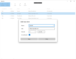 httpmon is a small tool to monitor websites availability. Define websites with monitoring intervals and see if they are available. You can define intervals in seconds, minutes or hours from 1 to 60. Also there is a feature to get local (toast) notifications, when the website becomes unavailable. There is ability to include/exclude website from monitored collection at any time without deleting it. Hope it will be useful.
