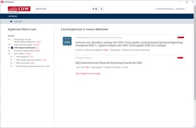 In der IDW Bibliothek finden Sie alle die von Ihnen erworbenen Produkte übersichtlich dargestellt. Damit vereint die IDW Bibliothek das umfangreiche IDW-Wissen zu den Themen Wirtschaftsprüfung, Rechnungslegung, Steuern und Compliance.