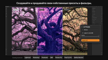 • Создание и продажа пресетов/LUT для Adobe Lightroom, Photoshop, Premier Pro, DaVinci Resolve, Final Cut Pro, Pixelmator и OBS.