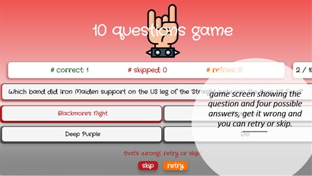 PLAYING THE GAME When the game starts, you will be presented with a question and four possible answers, selecting the correct answer will allow you to advance to the next question, if you get the question wrong, you will have the choice of retrying or skipping to the next question, get the question wrong for a second time and you will have to skip that question!
