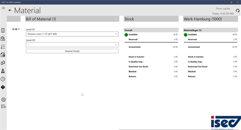 Highlights • Simple and fast online/offline integration in any backend system of SAP® Business Suite without middleware • A combined workflow inbox allows easy access to workflows from different backend systems • Customer specific enhancements are simply done with existing ABAP know how • This app is also available for other mobile operating systems • Secure mobile access to SAP® based on VPN or secure servers from BlackBerry Dynamics, MobileIron AppConnect or AirWatch • Simple usage of native device features such as photos, camera, GPS, contacts or barcodes • Customer specific color themes, icons and logos