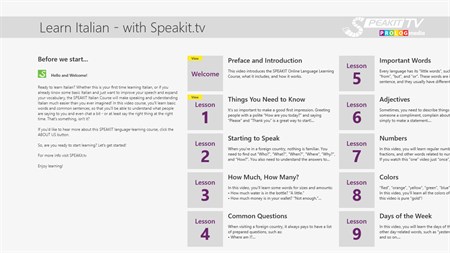Each SPEAKIT language-learning course includes the following videos: Preface and Introduction 1. Things You Need to Know 2. Starting to Speak 3. How Much, How Many? 4. Common Questions 5. Important Words 6. Adjectives 7. Numbers 8. Colors 9. Days of the Week 10. Telling the Time 11. Personal Details 12. Hotels 13. Car Rentals 14. Friends and Business 15. A New Language 16. Phone Conversations 17. Restaurants and Food 18. Taxis 19. Public Transportation 20. Shopping