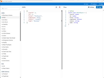 Json Code Converter is an application convert JSON into gorgeous, typesafe code in many programming languages. Json Code Converter supports many programing languages and file types: - cadence to go - css to js - css to tailwind - flow to javascript - flow to typescript declaration - flow to typescript - graphql to components - graphql to flow - graphql to fragment matcher - graphql to introspection json - graphql to java - graphql to resolvers signature - graphql to schema ast - graphql to typescript mongodb - graphql to typescript - html to jsx - html to pug - js object to json - json schema to openapi schema - json schema to protobuf - json schema to typescript - json schema to zod - json to big query - json to flow - json to go bson - json to go - json to graphql - json to io ts - json to java - json to jsdoc - json to json schema - json to kotlin - json to mobx state tree - json to mongoose - json to mysql - json to proptypes - json to rust serde - json to sarcastic - json to scala case class - json to toml - json to typescript - json to yaml - json to zod - jsonld to compacted - jsonld to expanded - jsonld to flattened - jsonld to framed - jsonld to normalized - jsonld to nquads - markdown to html - object styles to template literal - svg to jsx - svg to react native - toml to json - toml to yaml - typescript to flow - typescript to javascript - typescript to json schema - typescript to typescript declaration - typescript to zod - xml to json - yaml to json - yaml to toml
