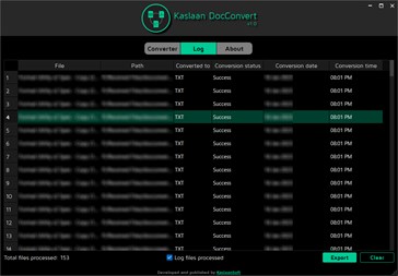 Log tab Any file processed, is logged in with all necessary details, i.e., file name, path, converted to, conversion status, conversion date, and time. Entire log could be exported to local CSV file, for your records. If you wish, processed file logging feature could be disabled from that same screen as well.