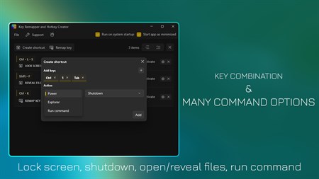CORE FEATURES Save time with "Create shortcut": + Explore: open Explorer, reveal file, folder in explorer. + Power: Shutdown, sleep, restart, lock screen. + Run command: run command in command prompt.