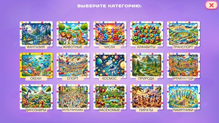 - ???? Погрузитесь в мир разнообразных категорий, включая Фантазию, Животные, Числа, Алфавит, Транспорт, Океан, Спорт, Космос, Природа, Сезоны, Динозавры, Мультфильмы, Пираты и Памятники! Каждая тема предлагает уникальное приключение и радость решения пазлов!