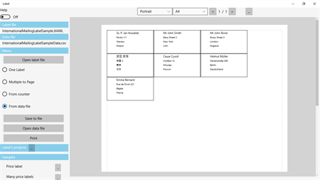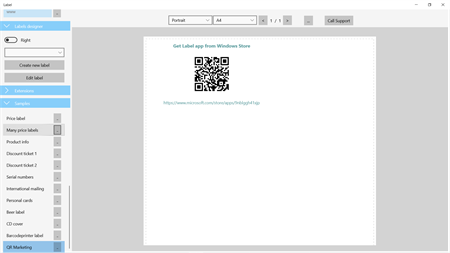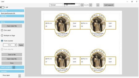 Aplication intended to printing labels and other small printables made as image file or made in XAML App is very helpful for printing labels in shops, hotels, offices, factories, warehouses, etc. App can be helpful for private wine, beer, etc. makers. Using this app you can print not only labels, but cards, identifiers or even business documents too. You can here: print one label or one document, multiple automatically label to page format and print such labels sheet, generate labels using counter, read data from data file, and automatically create labels with various data, next print them. There is some helpful sample labels, you can easilly adapt them to your needs. App contains some payable extensions, such as backup, webservice readers (for getting labels from webservices), etc. These extensions allow to use Label app in more advanced way. More advanced use of this app requires a base knowledge of XAML or desire to learn it.