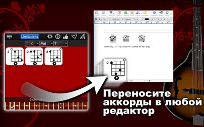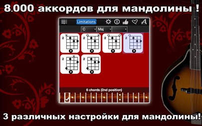 Mandolin Chords Compass Lite влючает в себя: - Число аккордов: 8.000. - Уникальная возможность прослушивать каждый аккорд на экране. - С помощью Drag&Drop Вы сможете перенести нужные Вам аккорды и сохранить их в своих музыкальных cборниках. - Поддержка 56 типов аккордов: Maj, Maj 6, Maj 7, Maj 9, Maj 11, Maj 13, Maj Maj7, Maj Add9, Min, Min 6, Min 7, Min 9, Min 11, Min 13, Min Maj7, Min Add9, Dim, Dim 6, Dim 7, Dim 9, Dim 11, Dim 13, Dim Maj7, Dim Add9, Aug, Aug 6, Aug 7, Aug 9, Aug 11, Aug 13, Aug Maj7, Aug Add9, Sus2, Sus2 6, Sus2 7, Sus2 9, Sus2 11, Sus2 13, Sus2 Maj7, Sus2 Add9, Sus4, Sus4 6, Sus4 7, Sus4 9, Sus4 11, Sus4 13, Sus4 Maj7, Sus4 Add9, 5, 5 6, 5 7, 5 9, 5 11, 5 13, 5 Maj7, 5 Add9, - Звук настоящей мандолины. - Приложение поддерживает все распространённые виды настроек: 1. Mandolin Standard, 2. Mandola Standard, 3. Mandocello Standard, - Поддержка для левшей. - Регулируемая громкость.