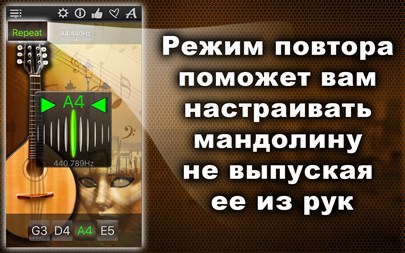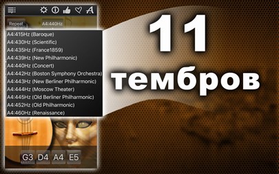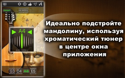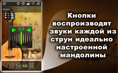 БЕСПЛАТНО пробуйте 1 день! Настройте Вашу мандолину быстро и точно! Простой и мощный тюнер поможет Вам в этом! Вы можете не только прослушивать звук каждой настраиваемой струны, но также проверить правильность настройки и "отшлифовать" её с помощью хроматического тюнера, который расположен в середине окна приложения! Апп-функции: * Хроматический тюнер с аудио-входом и поддержкой микрофона, * Генератор тона с оригинальным звучанием мандолины, * Автоматическое повторение проигрываемых звуков, * 11 тембров: + Барокко, + Научный, + Франция 1859, + Новый филармонический, + Концертный, + Бостонский симфонический, + Новый Берлинский, + Московский театральный, + Старый Берлинский филармонический, + Старый филармонический, + Ренессанс