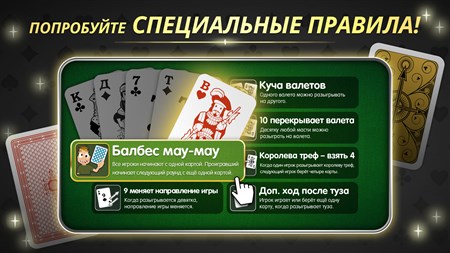НАСТОЯЩАЯ МАУ-МАУ – Используйте оригинальные карты Мау-Мау или особые карты с повышенной удобочитаемостью. – Множество колод: французская, турнирная, немецкая... – Играйте по особым правилам: «Куча валетов», «9 меняет направление игры», «Балбес Мау-Мау» и другим. – Настройте игру под себя.