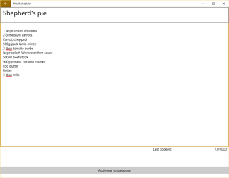 This, in combination with search by name and by tag, allows you to quickly settle on your next mission! Please note that MealScheduler really shines when you have entered many recipes.