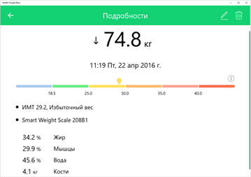 - Быстрый автоматический и ручной ввод данных; - Расчет Индекса Массы Тела – ИМТ (BMI); - Удобное отображение истории измерений; - Диаграммы статистики; - Специализированные графики трендов (день, неделя, месяц); - Возможность работы без регистрации и Интернет; - Синхронизация и резервное копирование в облаке MedM Health.