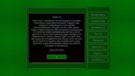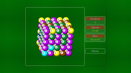 Цель игры - разобрать 3D конструкцию из шаров. Некоторые шары заминированы. Каждый шар содержит информацию о количестве заминированных соседей, но не о себе самом. Шары следует отметить белым (незаминированные) или красным (заминированные) цветом, а затем удалить их. Коснитесь нужного шара и выберите в появившейся панели нужный цвет или действие. Выигрыш засчитывается в том случае, если на поле не останется ни одного заминированного шара. Удаление шара, отмеченного неверным цветом, приводит к проигрышу.