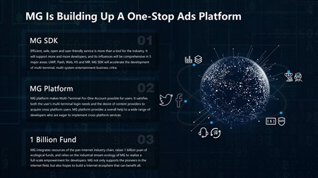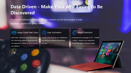 More than 1,100 developers have joined MG advertising platform.With 70 million users worldwide, MG AD has all the in-app and social media advertising traffic, enabling advertisers to access large-scale users of high quality from the whole world and bringing your quality products to those most in need.Trough understanding user preferences and showing innovative advertising pop-ups.Comprehensive coverage of "PC + mobile + offline", helping more advertisers achieve full chain marketing targets.