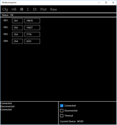 Users plot register values, or log current values on csv file. Multiple device settings can be stored, with settings such as IP address, register adders to read, remote port, etc. Settings can be stored both locally on the Windows 10 device, or using roaming to share settings across users account. Users can also inspect raw data send to and from remote device, for purpose of debugging communication problems.