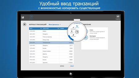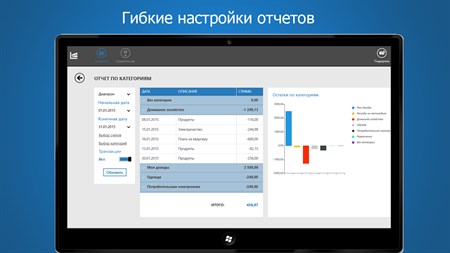 Moneygraph позволяет: - создавать несколько счетов - осуществлять перевод между счетами - создавать собственные категории - просматривать отчеты (предустановленные шаблоны включают анализ счета, остатки по счетам, анализ по категориям, совокупная стоимость) - настраивать и сохранять собственные отчеты - делать резервное копирование - синхронизировать данные между несколькими устройствами через OneDrive - защитить данные пин-кодом