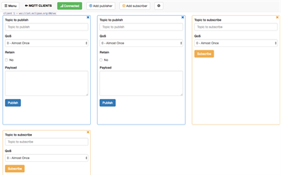 MQTT clients: -Create multiple concurrent MQTT clients connected to same or different MQTT brokers -TCP, SSL/TLS, Web Sockets and Secured Web Sockets support -Create MQTT clients with wide range of connection settings - Last will, keepAlive, connection timeout and much more (view all supported client settings) -Username/Password authentication -Option to connect, disconnect, reconnect MQTT client to brokers -Publish messages to multiple topics from same MQTT client -Subscribe to multiple topics from same MQTT client -Supports Single Level(+) and Multilevel(#) subscription to topics -Copy, republish payload with single click -View published and subscribed message history -Supports QoS 0,1,2