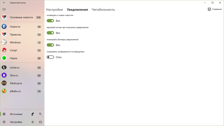 • получать уведомления o новых новостях • делиться новостями с друзьями • просматривать новостные ленты сгруппированные по ключевым словам • Прикрепить живые плитки, с самыми свежими новостаями, для основных новостей а так же для категорий, источников, тегов и авторов. • изменять портре��ную и альбомную ориентации • просматривать изображения статьи • добавлять понравившиеся новости в избранное • добавлять новости в список отложенного прочтения • организовать источники по категориям • читать статьи, используя расширенную читабельность без необходимости открывать их в веб-браузере • просматривать YouTube и HTML видео внутри приложения • проигрывать GIF анимации • искать конкретные новости • много других классных вещей • управля��ь прочитанными и непрочитанными новостями удобным образом