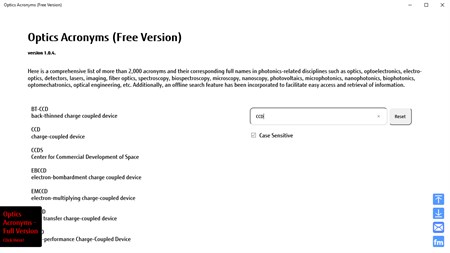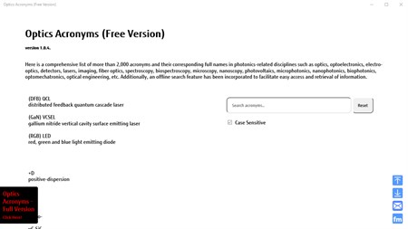 This Optics Acronyms (Free Version) consists of a comprehensive list of more than 2,000 acronyms and their corresponding full names in photonics-related fields. Additionally, an offline search feature has been incorporated to facilitate easy access and retrieval of information. You try this free-of-charge. And there is a full version also having listed more than 6,000 acronyms.
