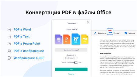 КОНВЕРТАЦИЯ PDF • Поддержка встроенного и облачного конвертеров • Поддержка преобразования PDF в Word, Excel, PPT, TXT и изображения (docx, xlsx, pptx, png & txt) • Поддержка конвертирования PDF в изображение