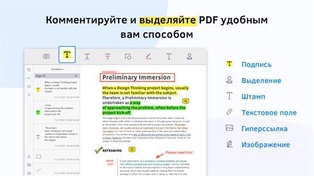 ПРИМЕЧАНИЯ И РЕЦЕНЗИРОВАНИЕ PDF • Добавляйте примечания в PDF с помощью выделения, подчеркивания, зачеркивания, добавления фигур, заметок и текстовых полей. • Добавляйте пользовательские штампы с датой и временем • Вставляйте гиперссылки на внешние веб-сайты, целевые страницы и адреса электронной почты • Вставляйте изображения в PDF