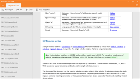 Perfect PDF from HTML is a simple, fast and powerful application for converting HTML content into PDF files. The application can import the structure of HTML files (including hyperlinks), not only a single HTML file; from the Internet or a local storage. It supports cascade style sheets (with restrictions), embedded fonts, raster and SVG images. Javascript, forms and objects are not supported at the moment. The product is focused on the import of static documentation, not on the import of dynamic or of rich media content.