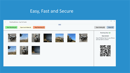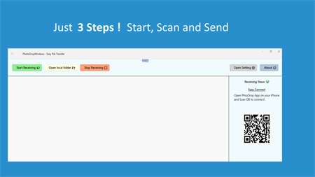 Say goodbye to cables and cords! With our app, you can effortlessly receive photos from your iPhone by simply scanning a QR code. This app offers a quick, easy, and secure way to transfer images from your iOS devices. It functions by hosting an FTP server and generating a QR code that contains the necessary connection details. Once connected, you can seamlessly receive photos from your iPhone. Features: # Wireless Photo Transfer: Transfer your photos without any physical connections. # QR Code Scan: Just scan the QR code to connect your iPhone to your PC. # Customizable Target Folder: Choose where you want to save your photos. # Cross-Apps: Different companion app for both iOS and Windows. # User-Friendly: Simple and intuitive interface for easy use. # Regular Updates and Support: Enjoy continuous improvements and reliable customer support.