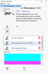 ===== Usage Instructions ===== 1) Launch the Printer Maintainer App. A countdown timer will start counting down the number of seconds until the test print will be sent to the printer(s) in the list. Click anywhere in the window to stop the timer. 2) Click the Print Delay menu to specify the number of seconds you want the app to delay before printing occurs. 3) Click the Add Printer button, select a printer. 4) Click the Print button to send the test print to the printer(s) in the list. 5) Use your favorite scheduling software to schedule Printer Maintainer to run at scheduled intervals (try for once a week to get started.). 6) Click the Quit button.