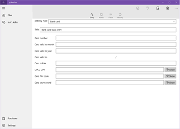 Ваши отзывы приветствуются. Менеджер паролей. Основан на проекте с открытым исходным кодом KeePass. Поддерживает KeePass 2.x формат базы данных. IT-поддержка: - Платежные карты! - История записей; - Пароль и ключевой файл, чтобы защитить вашу базу данных; - Испытующий - Настраиваемых поля - мусорная корзина - Оставьте свой отзыв. База данных паролей зашифрована и может совместно использоваться различными устройствами и платформами.
