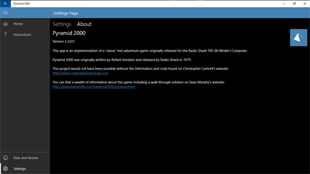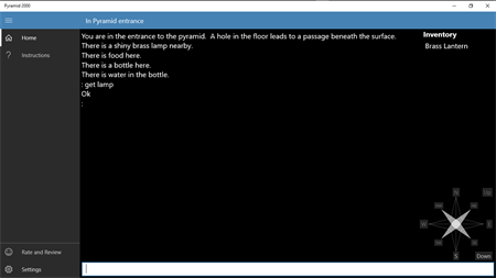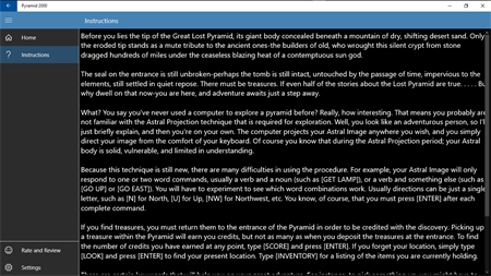 This is an implementation of a 'classic' text adventure game originally released for the Radio Shack Model I computer in 1979. It is a variation of the Colossal Cave adventure set in a Pyramid!