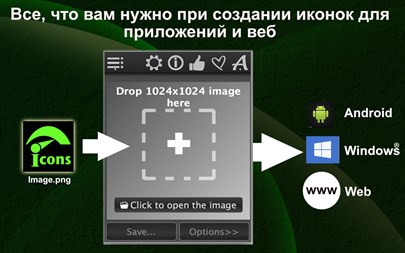 Всего несколько кликов и все готово! Перетащите изображение в окно приложения выберите имя и место, где вы хотите их сохранить, нажмите кнопку save и Quick Icons сделает все остальное за вас! Нет требований для минимального или максимального разрешения изображений. По окончанию создания новых значков, приложение откроет место их хранения.
